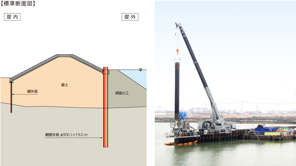 インプラント堤防TMは、躯体部と基礎部が一体となった許容構造部材を地中に挿し込むだけで構築されるシンプルな構造のため、早期に構築し機能を発揮させることができます。また、構造部材は鋼矢板や鋼管杭など様々な部材から選定でき、目的や用途に応じた合理的な設計を行うことができます。
