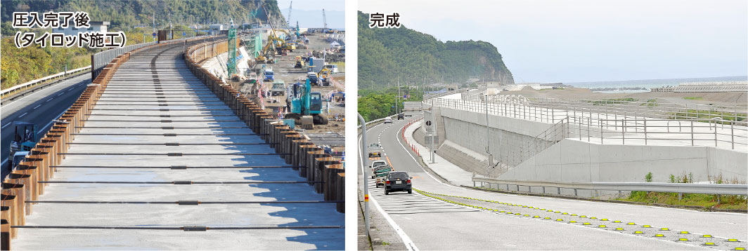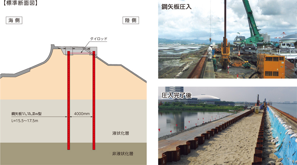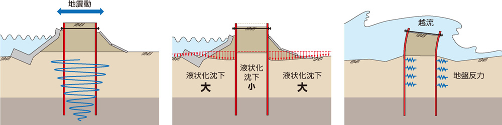 インプラント堤防TMは、地震・津波・地盤沈下などの複合災害に粘り強い堤防です。 耐震性については、地震動で堤防の法面が崩壊してもインプラント構造TMの杭連続壁は根入れが確保され大きな変形を生じません。また、杭連続壁によって液状化地盤の側方流動が抑制されることから堤体の沈下量が抑えられます。さらに杭先端を非液状化層まで根入れすれば、杭自体の沈下も発生せず堤体高を維持できます。津波に対しても、越流などで法面が崩壊してもインプラント構造TMの杭連続壁は形態が保たれ、堤防機能を維持することができます。 インプラント堤防TMは、地震や津波などの発災後に、耐え残った杭天端を利用し覆工板などを架設することで緊急輸送路やポンプ車による排水作業基地などとして活用でき、被災地の早期復旧にも役立ちます。