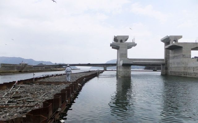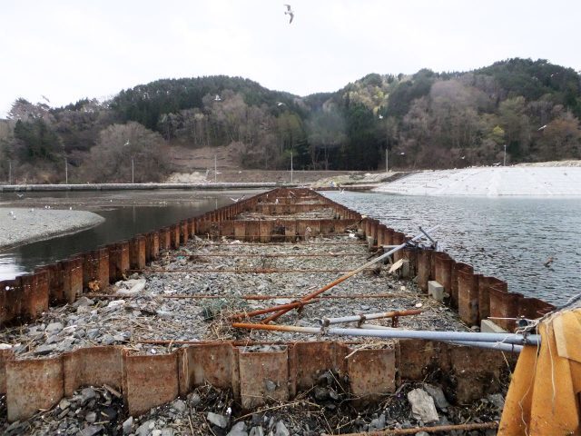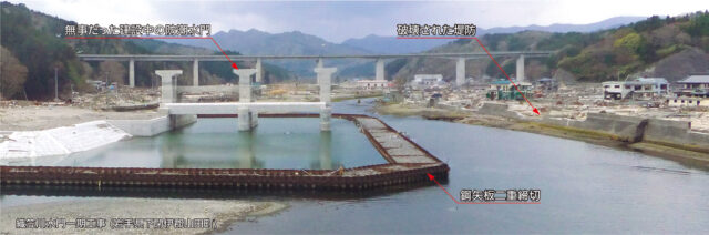 東日本大震災時に岩手県の織笠川の河口付近で、防潮水門建設のための仮設締切構造物として同様の構造が採用されていました。周辺の河川堤防は破堤し、住宅地は壊滅状態であったのに対し、鋼矢板二重締切工とその中に建つ水門には、津波の爪痕がほとんど見受けられず、図らずもその耐震性・耐津波性能の高さが証明されることとなりました。