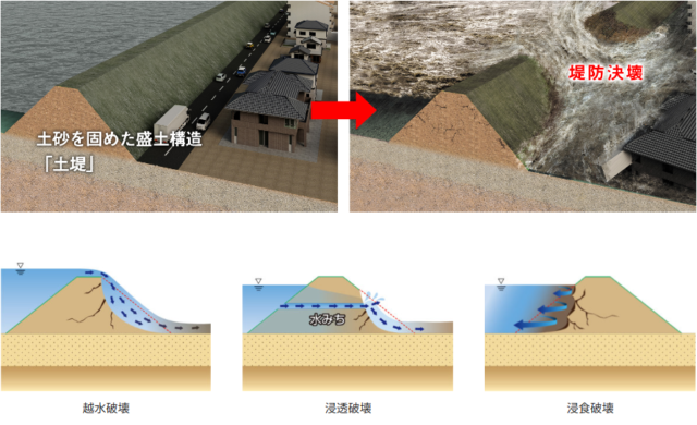 河川堤防の多くは土で造られ、洪水被害などを経て嵩上げ・拡幅が重ねられています。