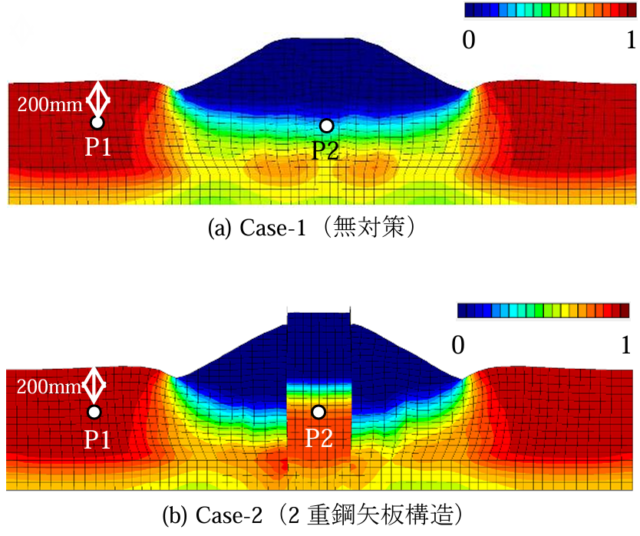 液状化を伴う地震によって堤体側面が崩れる状況においても、2列の鋼矢板壁およびタイ材がコア部の変形を抑制し、支持地盤に打設された鋼矢板壁によって天端高さが維持されることを明らかにしています。