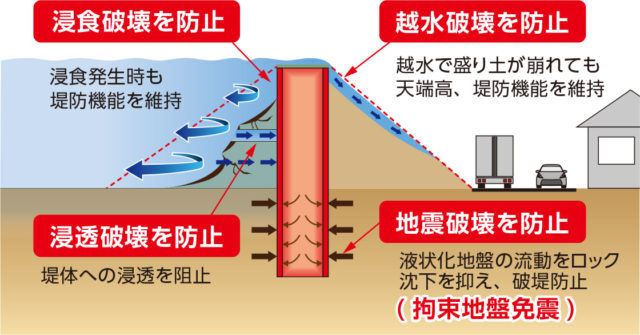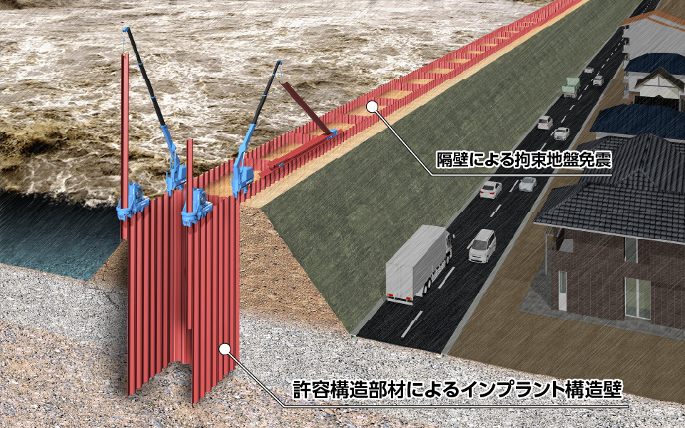 「インプラントロック堤防TM」は、越水や浸透で盛土が削られても壁体自体が堤防機能を保って破堤を防ぎます。加えて、地震時には2列の鋼矢板と隔壁によって囲まれた地盤を「拘束」すること(拘束地盤免震)で液状化地盤の流動を抑制して地盤沈下を抑えます。越水や浸透だけでなく、大地震が生じても「壊れない」ことを目指した構造がこの堤防の大きな特徴です。