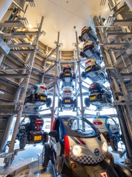 省スペースかつ高収容、スピーディーな入出庫に、駐車中の自動充電という付加価値を持たせた超小型EV 専用の機械式駐車場です。超小型EV 普及の課題となっている駐車スペースと充電施設の不足を一挙に解決し、カーボンニュートラルに寄与。外からでも内部のなめらかな機械動作を見ることができ、「魅せる駐車場」としても、機能的で持続可能な街づくりに貢献します。