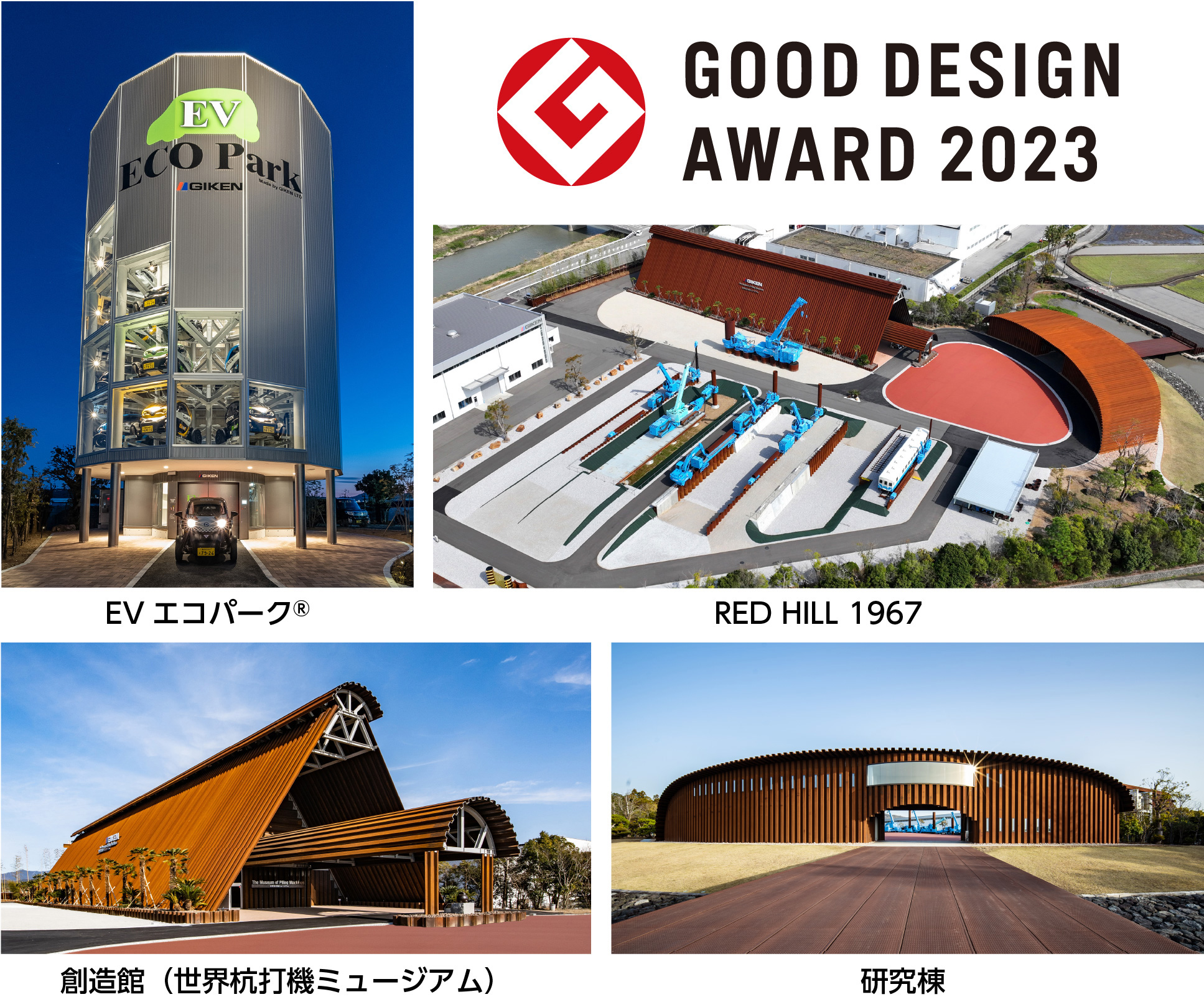 当社グループ企業・株式会社技研製作所(本社:高知市、代表取締役社長:森部慎之助)の超小型 EV 専用機械式駐車場「EVエコパーク®」、圧入技術の優位性の情報発信基地「RED HILL 1967」および施設内の「創造館(世界杭打機ミュージアム)」「研究棟」が、公益財団法人日本デザイン振興会が主催する「2023年度グッドデザイン賞」を受賞しました。本賞は形の美しさだけでなく、人、社会そして未来を豊かにすると認められたものに授与されます。