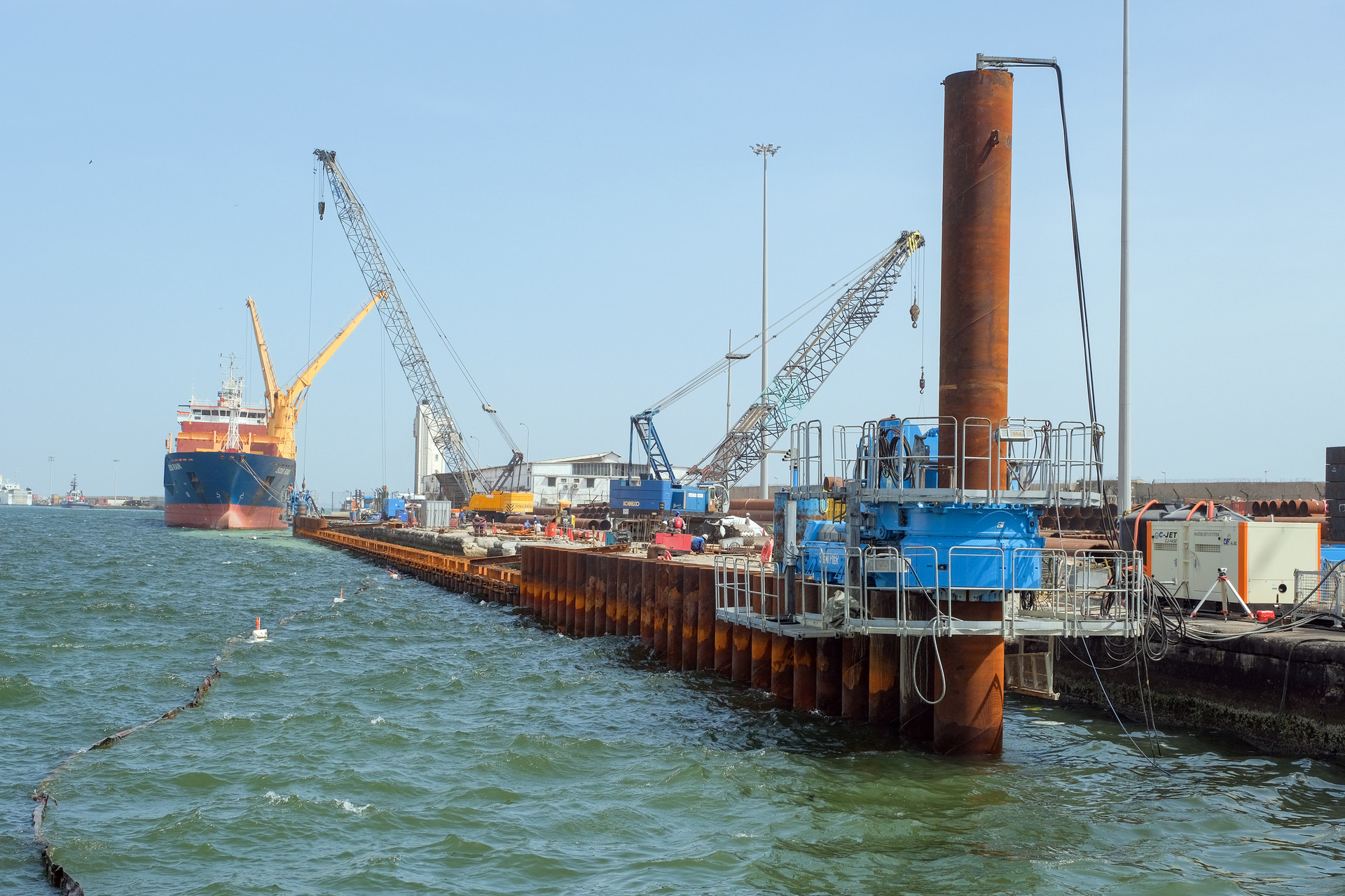セネガル共和国・ダカール港において、技研施工が鋼管杭回転切削圧入工法「ジャイロプレス工法®」による延長約 350m の岸壁改修工事(圧入工事部分)を 2021 年 3 月に完了した案件です。
