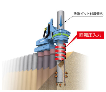 鋼管杭の先端に切削爪を付けて回転圧入することで硬質地盤、さらにはコンクリートなどの地中障害物を貫通し、地震や津波に粘り強く耐えるインプラント構造物を短期間で造ります。既存構造物を撤去せずに圧入でき、現状機能を維持したまま機能強化、再生が可能です。硬質地盤や地中障害物が埋まる地盤において、従来工法は地盤を掘削し、砂に置き換えるなどの作業が必要ですが、ジャイロプレス工法®はその手間が要りません。また、機械は施工した杭上を自走できるため広大な作業スペースや作業用仮設工事が不要。従来工法の無駄を省き、工期、工費を縮減します。