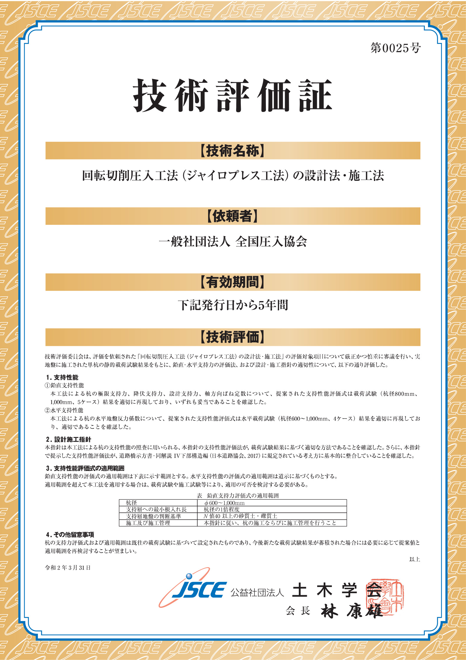 株式会社技研施工(本社:高知市、代表取締役社長:大平厚)のグループ会社・株式会社技研製作所(本社:高知市、代表取締役社長:北村精男)の「ジャイロプレス工法®」が、公益社団法人土木学会の技術評価を受け、同工法で圧入した鋼管杭の支持杭としての性能が認められました。この評価により、道路橋梁の基礎部といった鉛直支持力が求められる案件における同工法の活用範囲が拡大し、提案の幅がいっそう広がります。本評価を受けたことで、現場によっては施工後に杭の支持力を調べる載荷試験を省略でき、工期の短縮と工費の縮減を実現します。今回の土木学会への評価は、一般社団法人全国圧入協会(JPA)が依頼したものです。