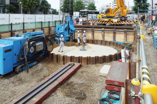 The role of GIKEN SEKO is to complete the construction part of these projects, from the press-in work required when constructing the frames to installation of mechanical equipment. The company has developed construction methods that use prefabrication, and do not need temporary works, to achieve rational and rapid construction. In this way, the continuous walls, constructed by installing piles in a cylindrical shape, can be used directly as earthquake-proof structural walls for the car and bicycle parking facilities.