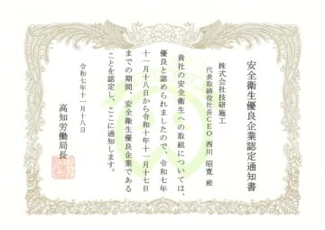 株式会社技研施工(本社:高知市、代表取締役社長CEO:西川昭寛)は、11月18日、労働者の安全や健康を確保するための対策に積極的に取り組み、高い安全衛生水準を維持・改善している企業として、厚生労働省が認定する「安全衛生優良企業」に認定されました。