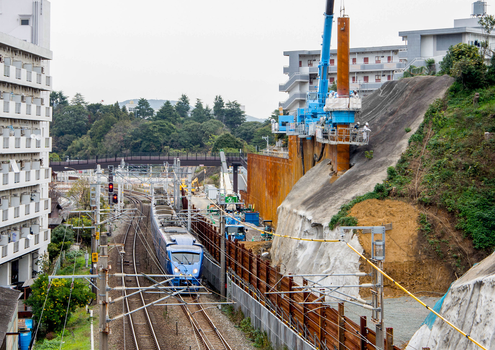 ジャイロパイラー®による切土擁壁構築工事(北九州市)。杭上を自走できるGRBシステムは作業用仮設工事が要らず、転倒の恐れがありません。線路横の急斜面でも鉄道運行を妨げず施工可能です。
