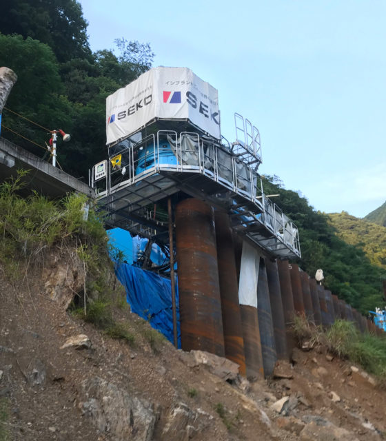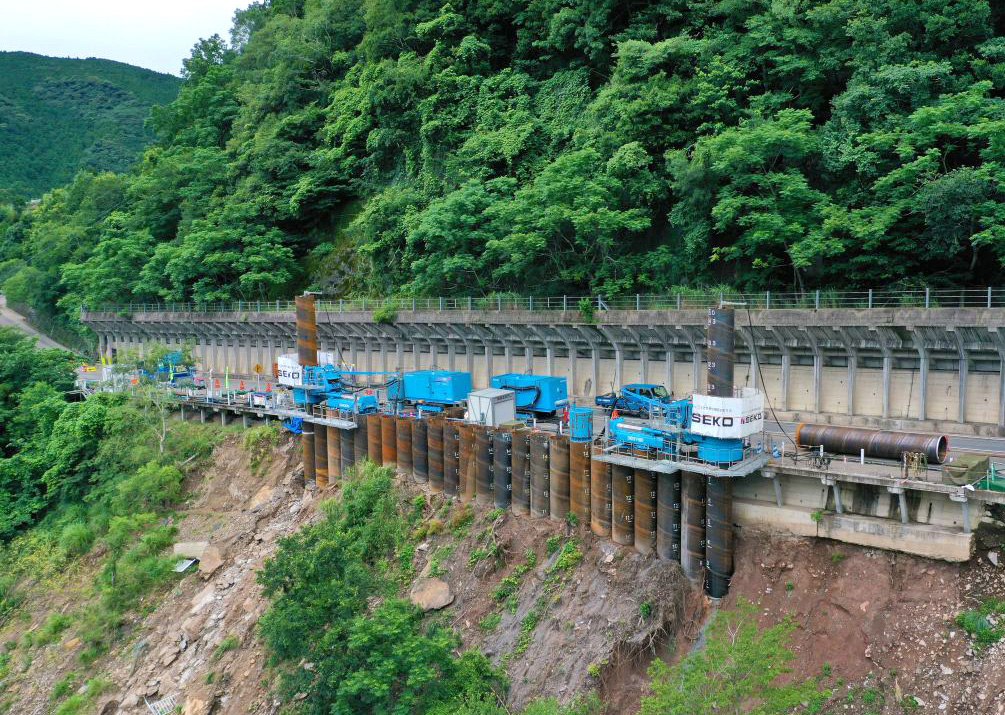 工事では、サイレントパイラー®F401-G1200 の2台同時施工により直径 1200mmの鋼管杭43本を圧入し、延長60mにわたって、洗堀や背面土砂の流出による路肩崩壊に耐える「インプラント