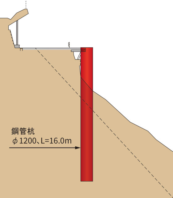 構造®」の道路擁壁を構築しました。杭間からの土砂の流出を防ぐため、大口径の鋼管杭の間に直径318.5mm の小口径鋼管42 本を圧入して隙間を埋めました。