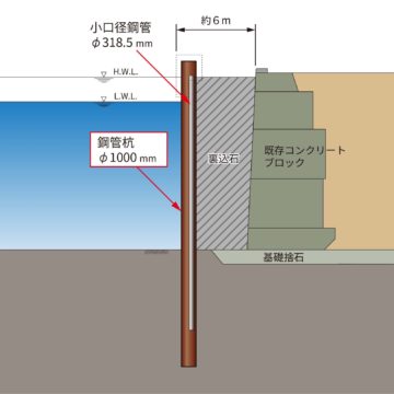 当初はコンクリート製のブロックを海中に積み上げる計画が立てられました。しかし、岸壁位置を海側へ約 22m前出しするため、対岸埠頭との間が狭まり、船舶運航の安全性や利便性が低下する恐れがありました。また作業台船を使用するため、工事中の接岸や荷役の安全性にも課題が残りました。