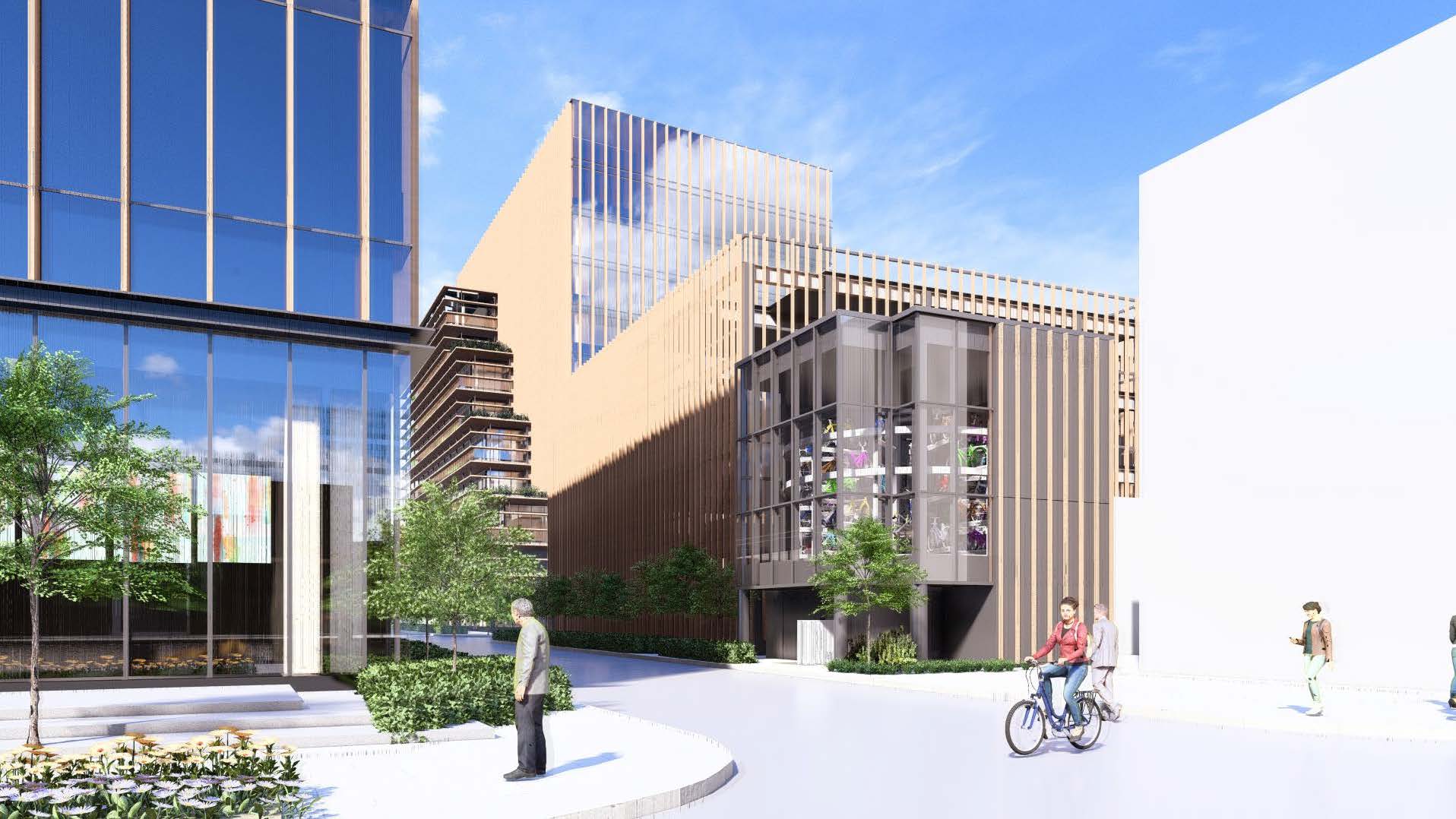 四国銀行本店ビルは、南海トラフ地震等の大規模災害に備え、建物の安全性確保と業務継続態勢の強化を目的に建て替えが決定されました。市街地にある現在の本館、別館および駐輪駐車場の敷地を活用し、駐車場棟・駐輪場棟(エコサイクル™)、新本部棟、新本店棟の順に実施。新本店ビルは免震構造を採用する他、高知県産材や県産植物が活用されます。
