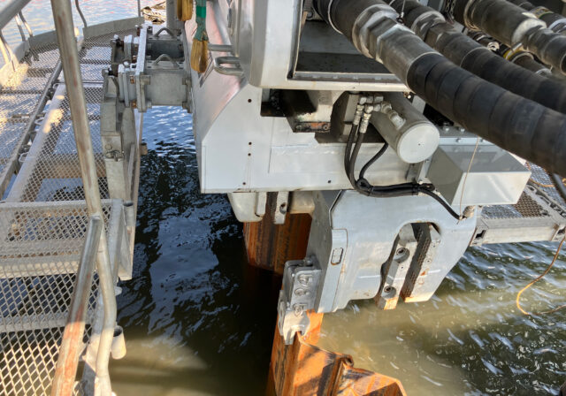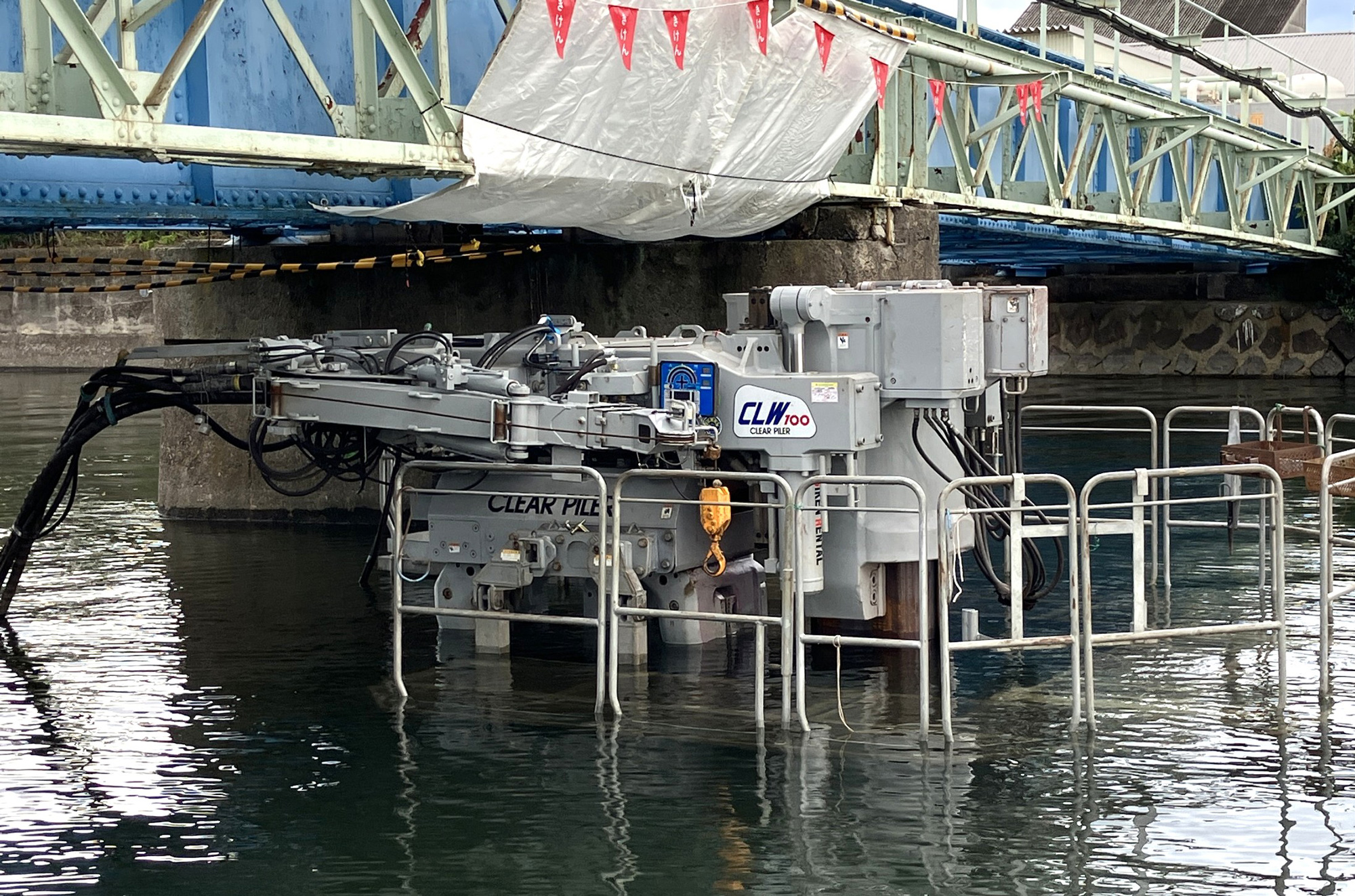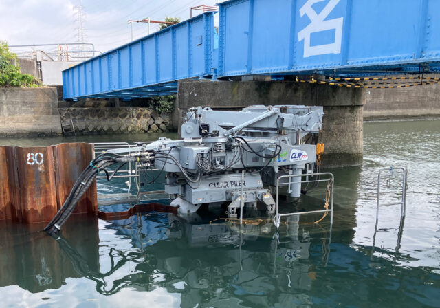 頭上に障害物がある現場に対応する低空頭専用機種の「クリアパイラー™」をベースに、油圧機器や電装部品を防水仕様に改良。現段階では水深2m、水圧0.02MPaまで耐えることが可能です 。市場への投入を見据え、当社は名古屋・大江川改修工事で初めて現場施工を行いました。干満差2.3m、満潮時にはサドル部分が水に浸かってしまうような条件下で、機械を撤去させることなく止水壁を完成させました。