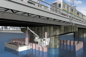 水上や傾斜地、不整地など足場が不安定な場所でも、仮桟橋など仮設工事を一切必要とせず、杭の搬送・建て込み・圧入の全作業を杭上で行えるGRBシステムを用いた圧入工法です。必要スペースは機械幅のみに抑えられ狭隘地にも対応しています。