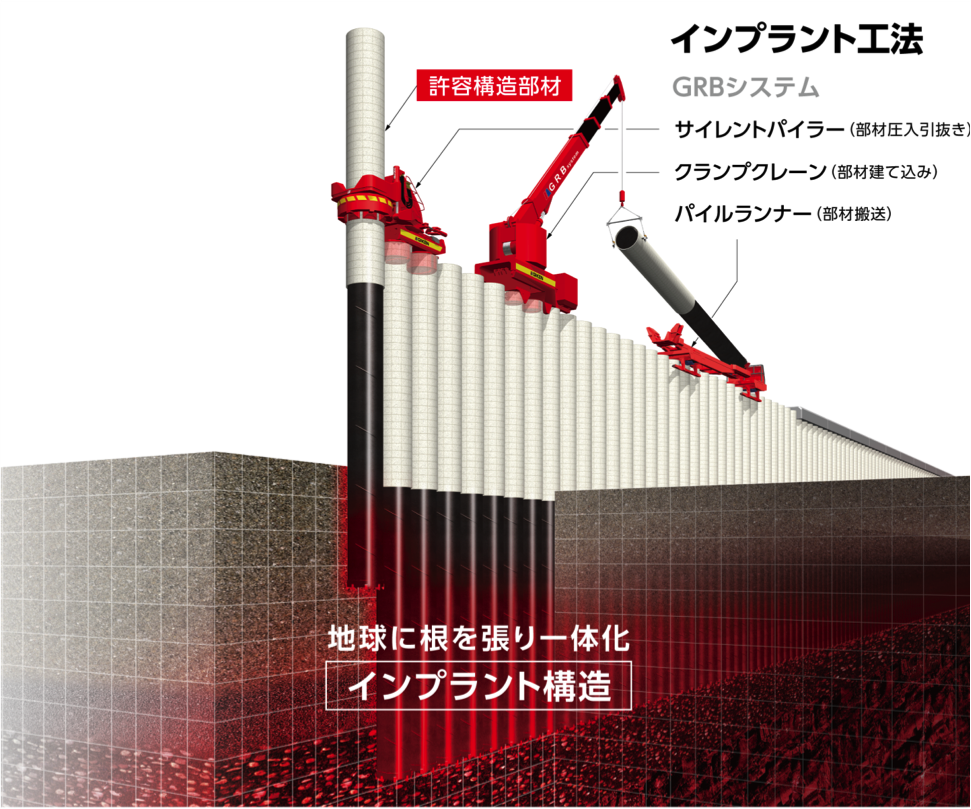 インプラント工法TMは、躯体部と基礎部が一体となった「許容構造部材」を油圧による静的荷重で地中に押し込み、地球と一体化した粘り強い構造物(インプラント構造物)を構築する工法です。工場生産される許容構造部材は、一本一本が工業製品として高い剛性と品質を有しており、部材の大きさと地盤への貫入の深さによって、鉛直方向や水平方向からの外力に対して高い耐力を発揮し、粘り強い構造体を形成します。