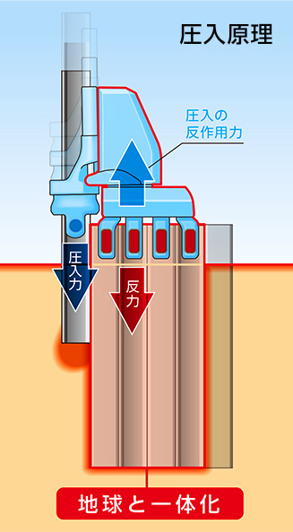 圧入では、この反作用力よりも大きな「反力」がなければ、杭を地盤に押し込むことはできません。地球の重力を反力として用いる方法もありますが、機械装置が大型化し実用的ではありません。